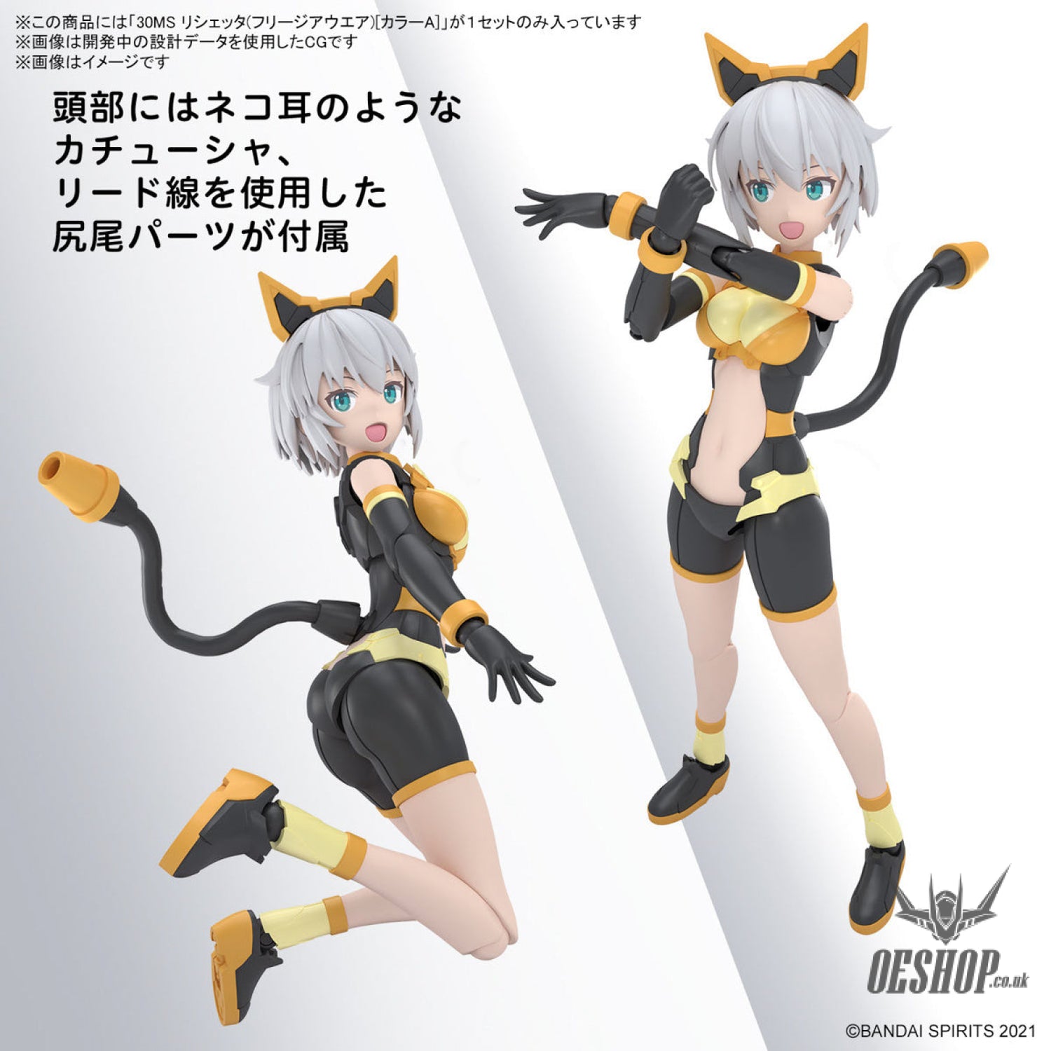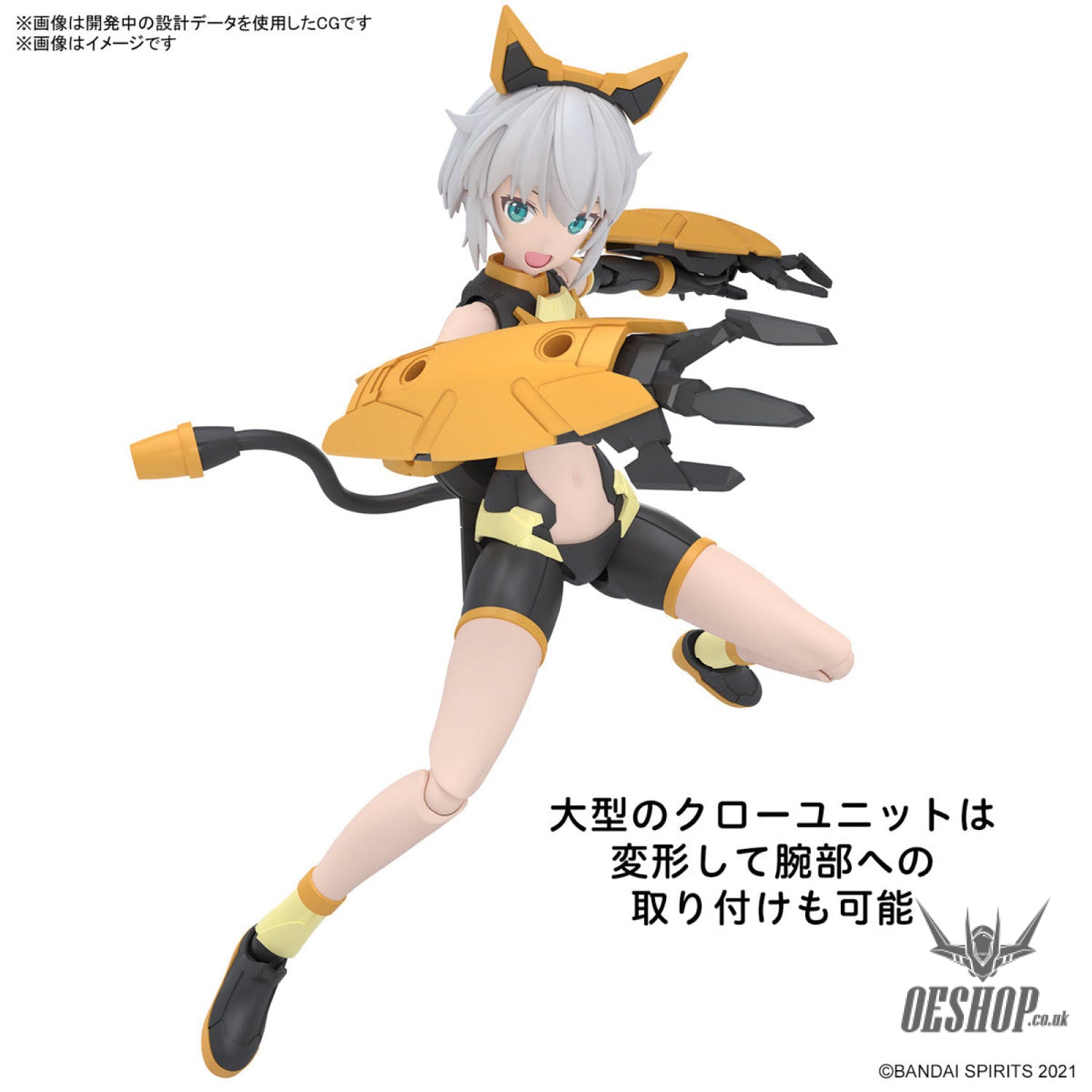 Rishetta returns to Bandai's "30MS (30 Minutes Sisters)" model-kit lineup with a completely new design! The parts on the runners are arranged in a way that's optimal to ease of assembly and efficient work flow, allowing for smooth assembly. You can customize her into her armed mode by assembling the armor parts! Three tampo-printed facial expressions are included: normal, smiling and confused; a large claw unit is suspended from her backpack, and it can be transformed and attached to an arm. The head comes with a cat-ears headband and a tail part made with lead wire for flexibility. The abdomen has a mechanism to prevent the hip joint parts from coming off, so the structure is designed to prevent them from separating when moving the legs during posing. Additional "30MS" optional parts such as faces, hairstyles and body parts are sold separately, so you can customize her to your heart's content! The soles of her shoes have 3mm joints suitable for customization, too. Order her for your own collection today!