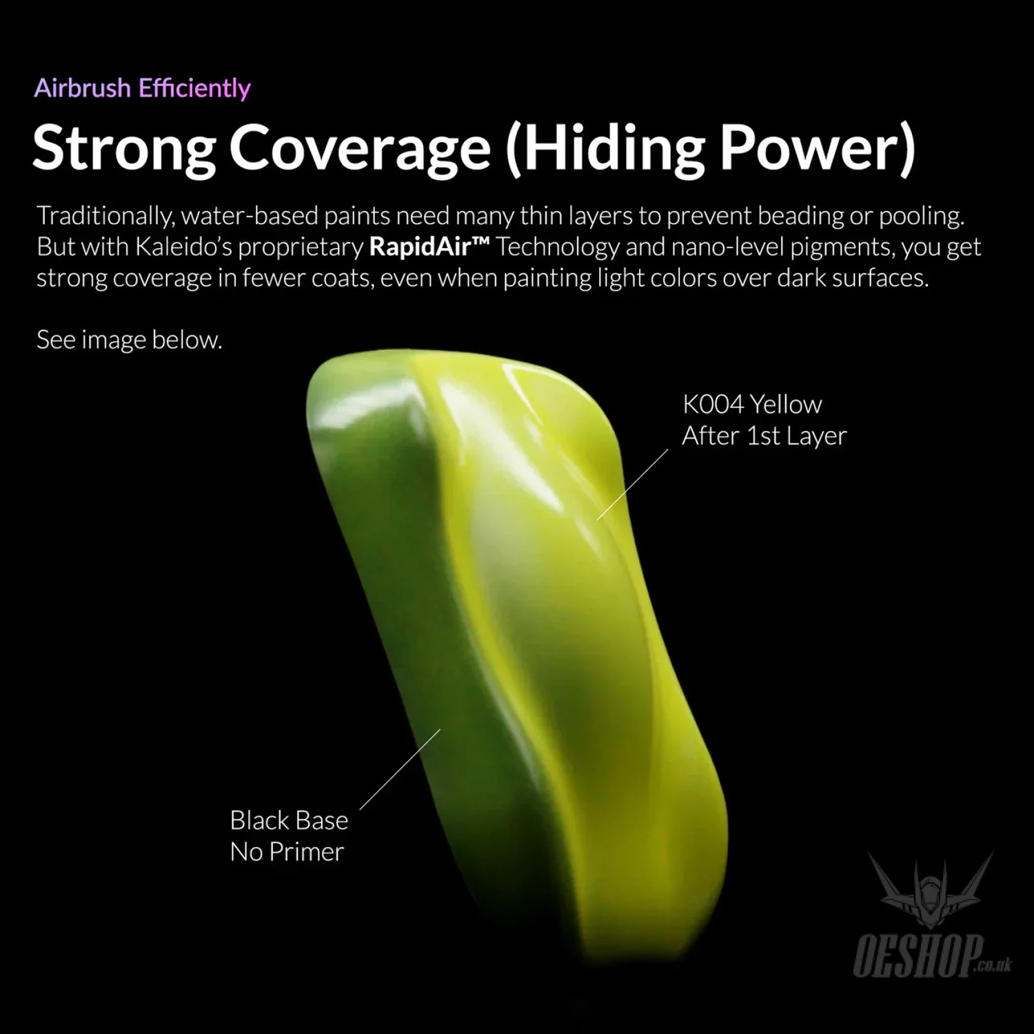 - Kaleido paints are pre-thinned water-based acrylics, ready for use straight from the bottle with 0.3–0.5mm airbrushes.