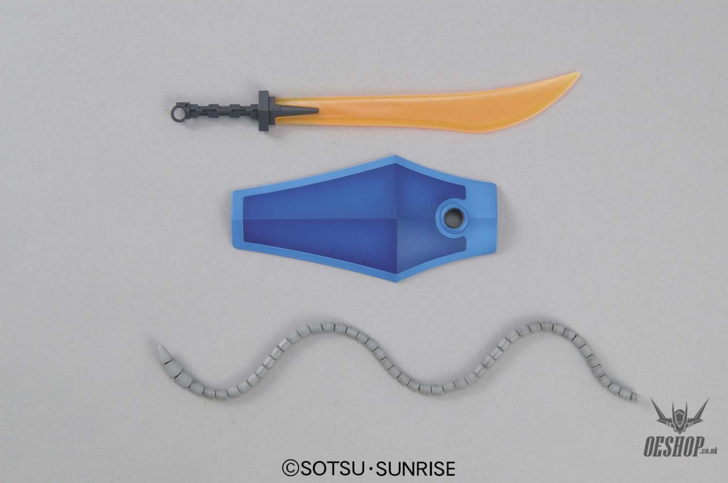Its signature weaponry includes a shield, a Heat Saber, a Heat Rod, and a Finger Vulcan for its left hand. A regular manipulator left hand is also included to replace the Finger Vulcan if you so desire. Each section of the Heat Rod is ball-jointed so you can bend it into any shape you want! The blade part of the Heat Saber is made of clear orange, and the Mobile Suit's cockpit can slide open to reveal a sitting-pose pilot figure (molded in light blue). Also packed in the set are in-scale figures (molded in light blue) of Ramba Ral and his aide Crowley Hamon. A sheet of stickers and dry-transfer markings are included.