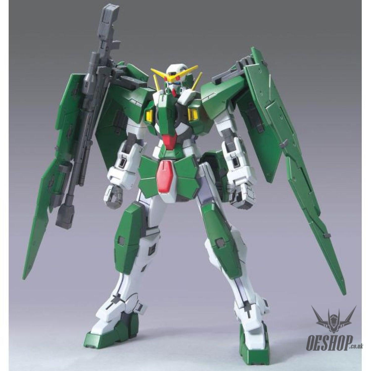 Here's an excellent snap-fit assembly kit of Lockon Stratos' personal Mobile Suit, Gundam Dynames! Molded in color, it will be articulated with plenty of polycap joints upon completion and will feature foldable GN shields to the front for front guard mode. Its GN sniper rifle can be set up with tripod support and can also be stored on its right shoulder armor. The yellow antenna on its head can be slid down to reveal a gun camera for precision sniping. A sheet of foil stickers is included for detail. Not a drop of glue or paint required, although painting it would add a more realistic appearance.