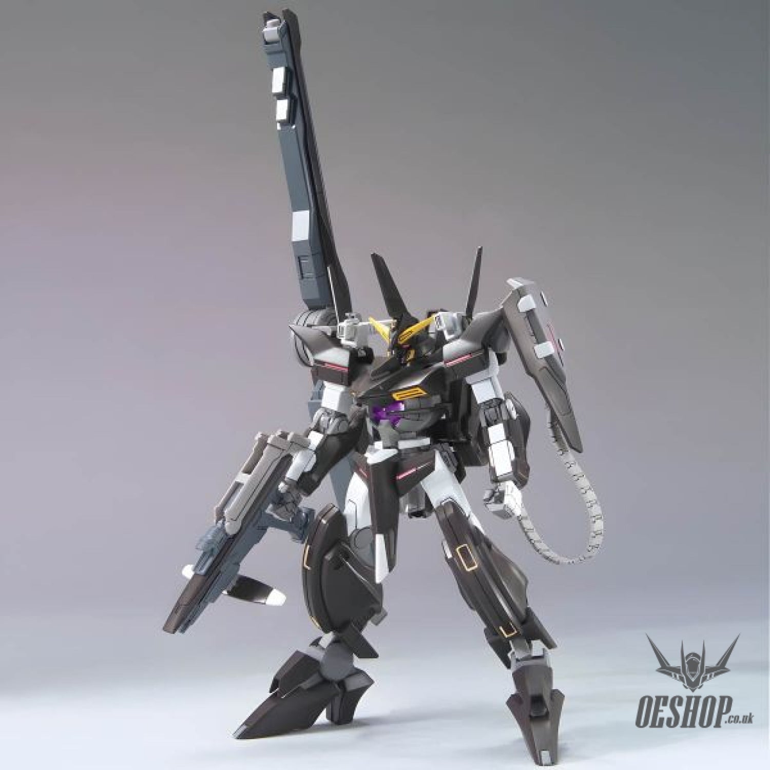 The black Gundam Throne Eins, as piloted by Johann Trinity in "Gundam 00," makes its debut in plastic kit form in Bandai's HG Gundam 00 series! Specializing in long-range attacks, this Mobile Suit comes equipped with a GN beam rifle, GN shield, and a devastatingly powerful GN launcher that will measure 27cm long when deployed! This sharply molded kit has polycap joints and will be fully articulated upon completion. A sheet of foil stickers is included for detail. Not a drop of glue or paint required, although painting it would add a more realistic appearance.