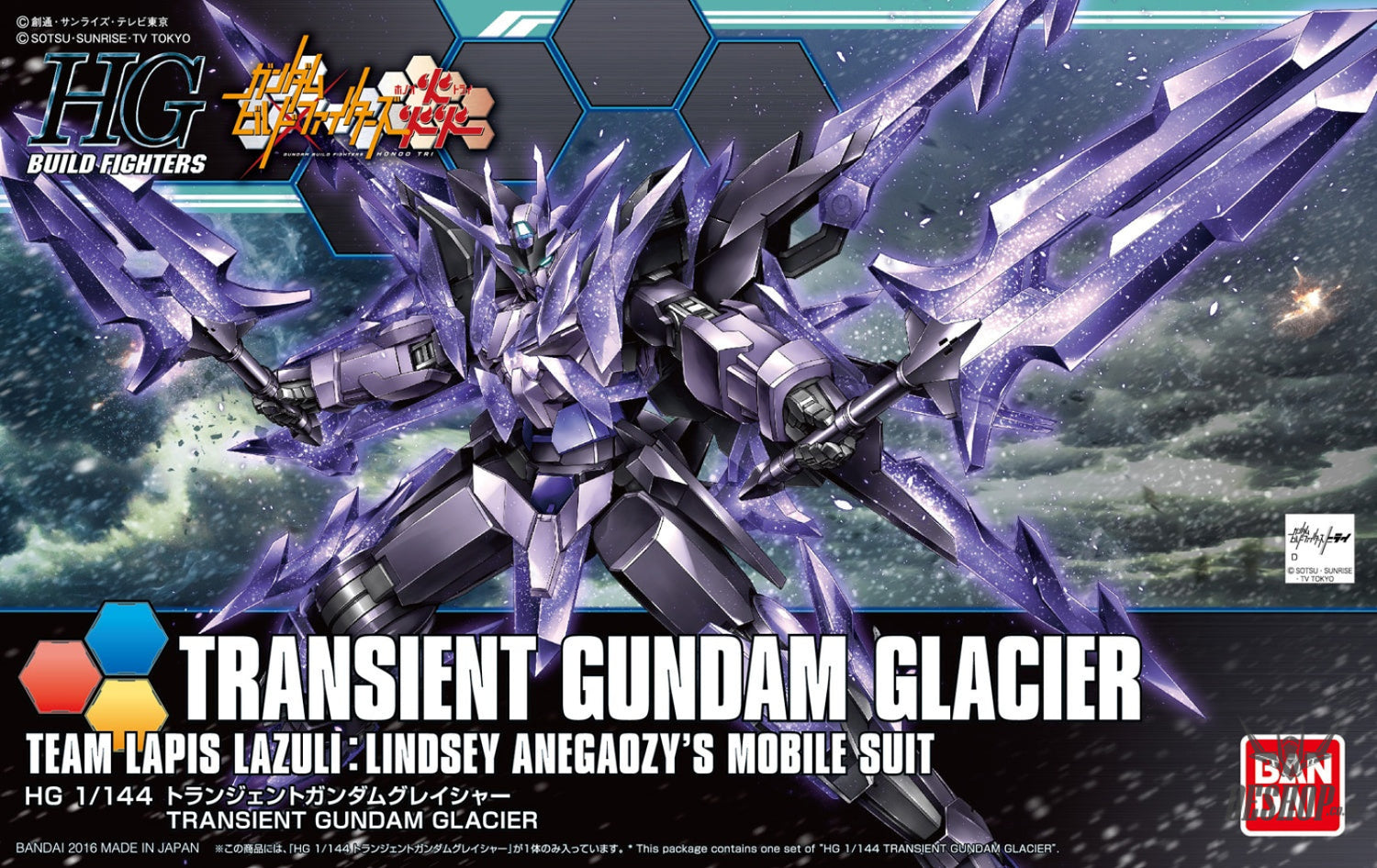From the photonovel series "Gundam Build Fighters Honoo Try" comes a kit of the Transient Gundam Glacier! Its distinctive purple and black color scheme and its sharp form make for a menacing opponent on the battlefield. Includes two giant lances. Order today!