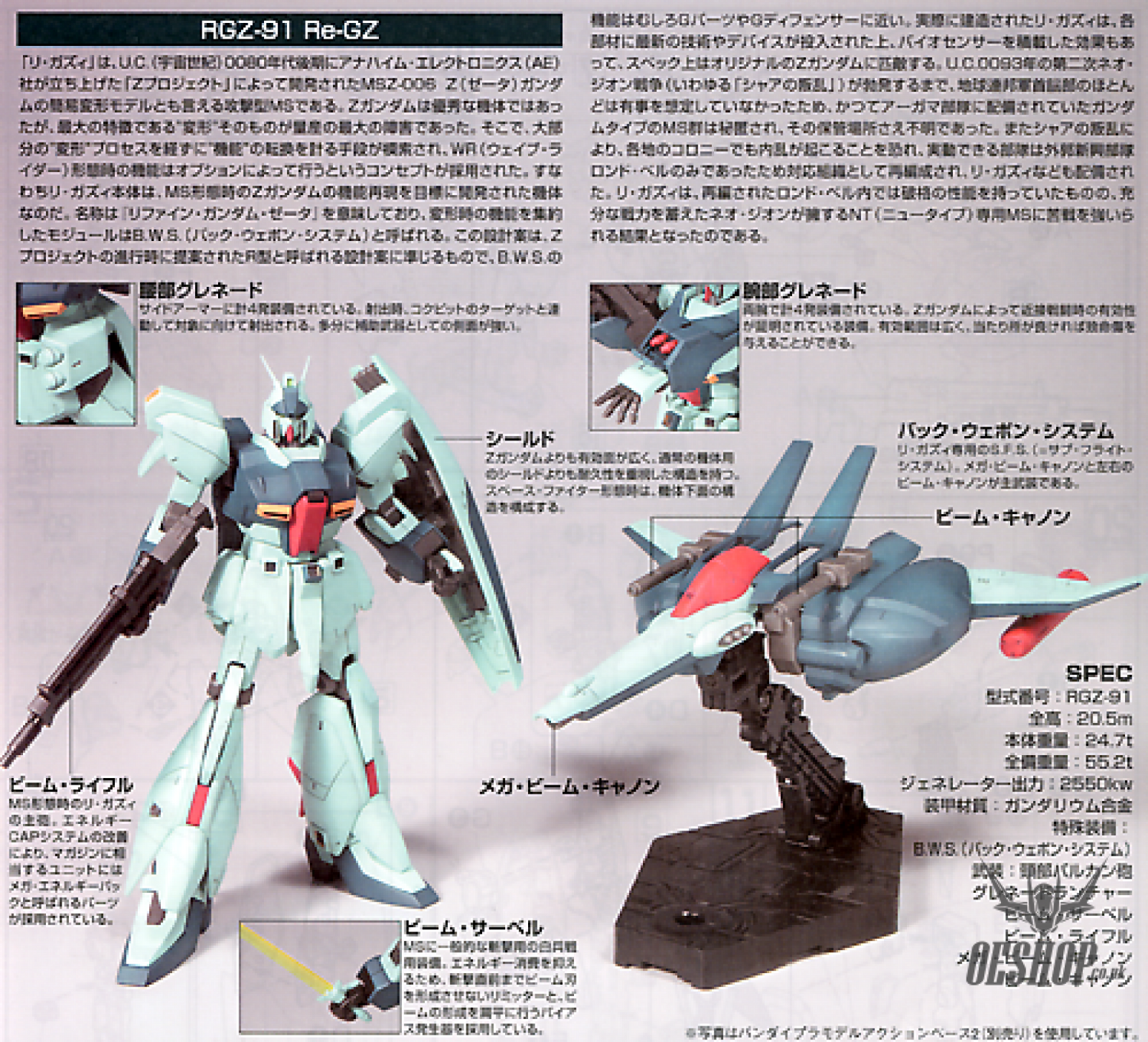 The much-anticipated HGUC kit of Re-GZ is here and is definitely not one to disappoint! Sharply molded in color, this snap-fit assembly kit of the refined Zeta Gundam will be highly poseable upon completion thanks to the use of polycaps in joints. Of course, Re-GZ is not without its B.W.S. (Back Weapon System), used to transform into Space Fighter mode when a boost in speed is called for. Re-GZ's features include saber racks on the backpack that can open for storing its beam sabers, the grenade launchers on the left forearm can slide out, and its beam rifle can be stored behind the shield when in Space Fighter mode. A sheet of foil stickers is included for detail. Not a drop of glue or paint required, although painting would add a more realistic appearance.