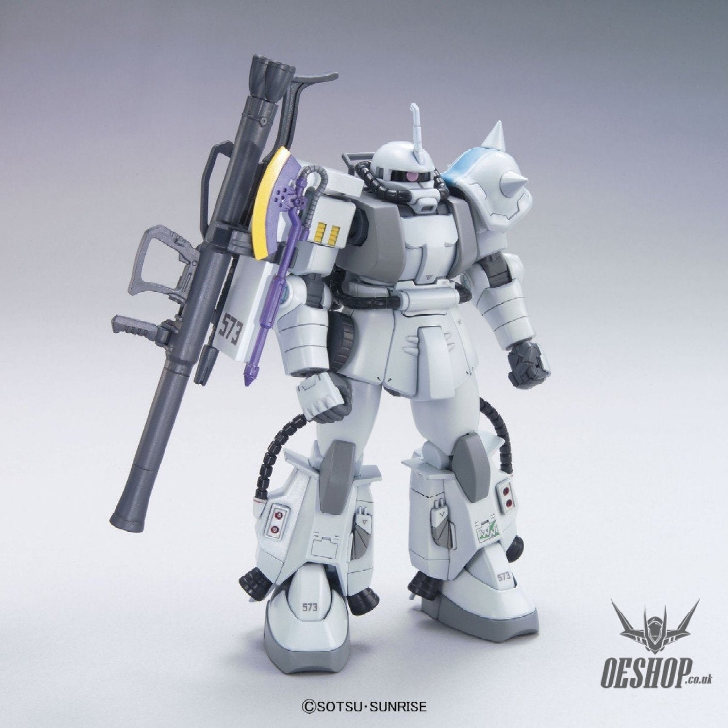 Shin Matsunaga, a Zeon ace from the One Year War, makes his debut in the HGUC line with his signature all white Zaku. This model features the iconic multiple leg thrusters and modified backpack as well as two types of command antennae along with Zaku bazooka, machine gun, heat hawk, shield weapon rack and a variety of expressive hands. Shin Matsunaga's custom parts on shoulder and front skirt have been included.