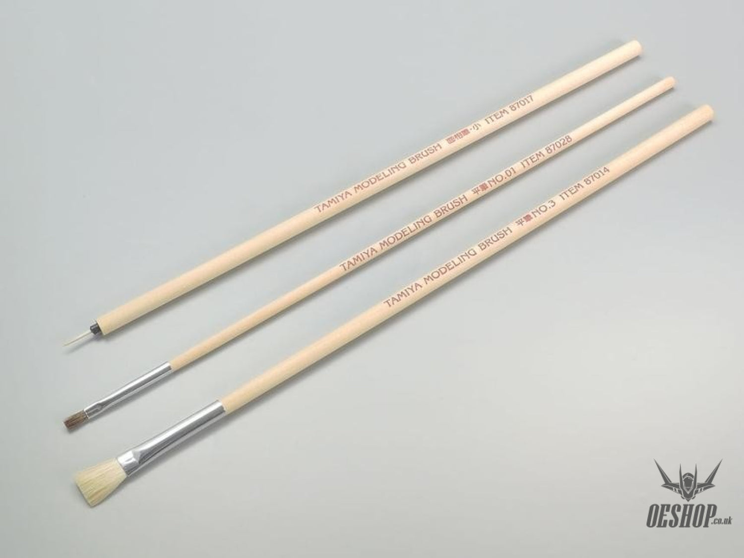 This handy set includes three different paint brushes commonly required in the finishing of plastic models. These include No.3 (8mm width) and No.01 (3mm) flat brushes, plus a small pointed brush for fine detail. The horse-hair bristle brushes feature a wooden handle designed to reduce strain on the hand.