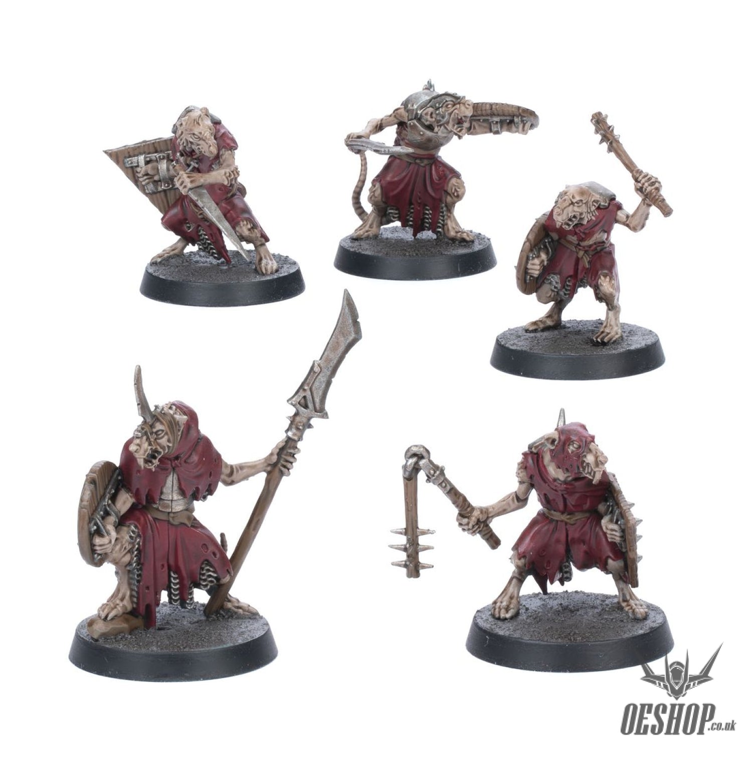 5x plastic, push-fit Skaven Clanrat miniatures and 5x Citadel 25mm Round Hex Hole Bases