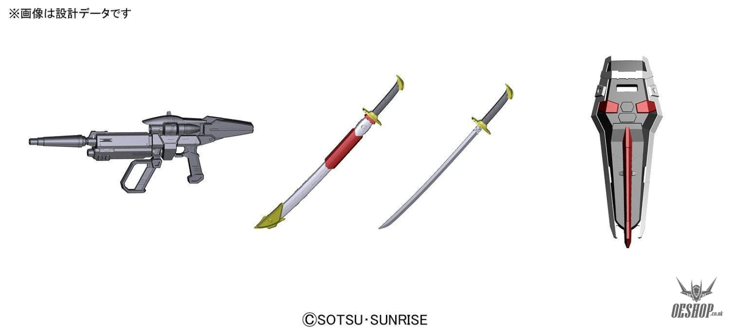 The Real Grade Gundam Astray Red Frame has a completely new design for its inner frame, based on the idea that a Mobile Suit would not move identically to a human body. The newly designed inner frame corresponds to the skeleton, and the outer frame serves as the muscle structure. Included are the Gerbera Straight katana, a beam rifle, a shield, two beam sabers, and a pilot figure.