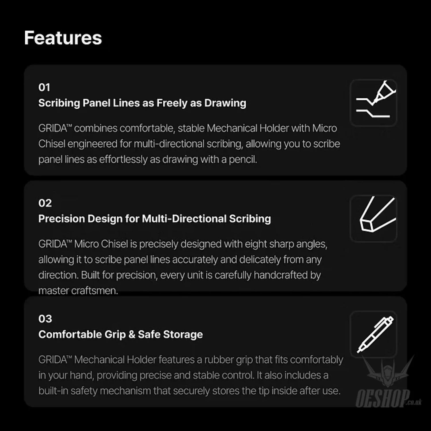GRIDA™ combines comfortable, stable Mechanical Holder with Micro Chisel engineered for multi-directional scribing, allowing you to scribe panel lines as effortlessly as drawing with a pencil. It can scribe between 0.15mm to 0.2mm lines and up to 0.3mm by scribing multiple times.