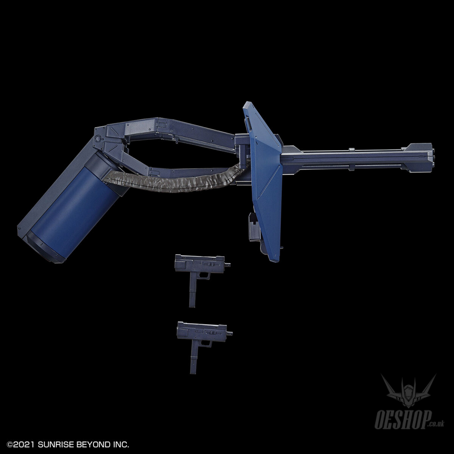 This mecha comes equipped with a 45mm rotary armor machine cannon to overpower its foes. The shields on its shoulders can even attach to the machine cannon for extra protection against enemy fire, and the outrigger in the rear skirt can be extended with exchangeable parts for when it needs to keep steady while firing its big cannon. The Jogan also comes with 40mm portable short autocannons for when it needs to attack on the move.