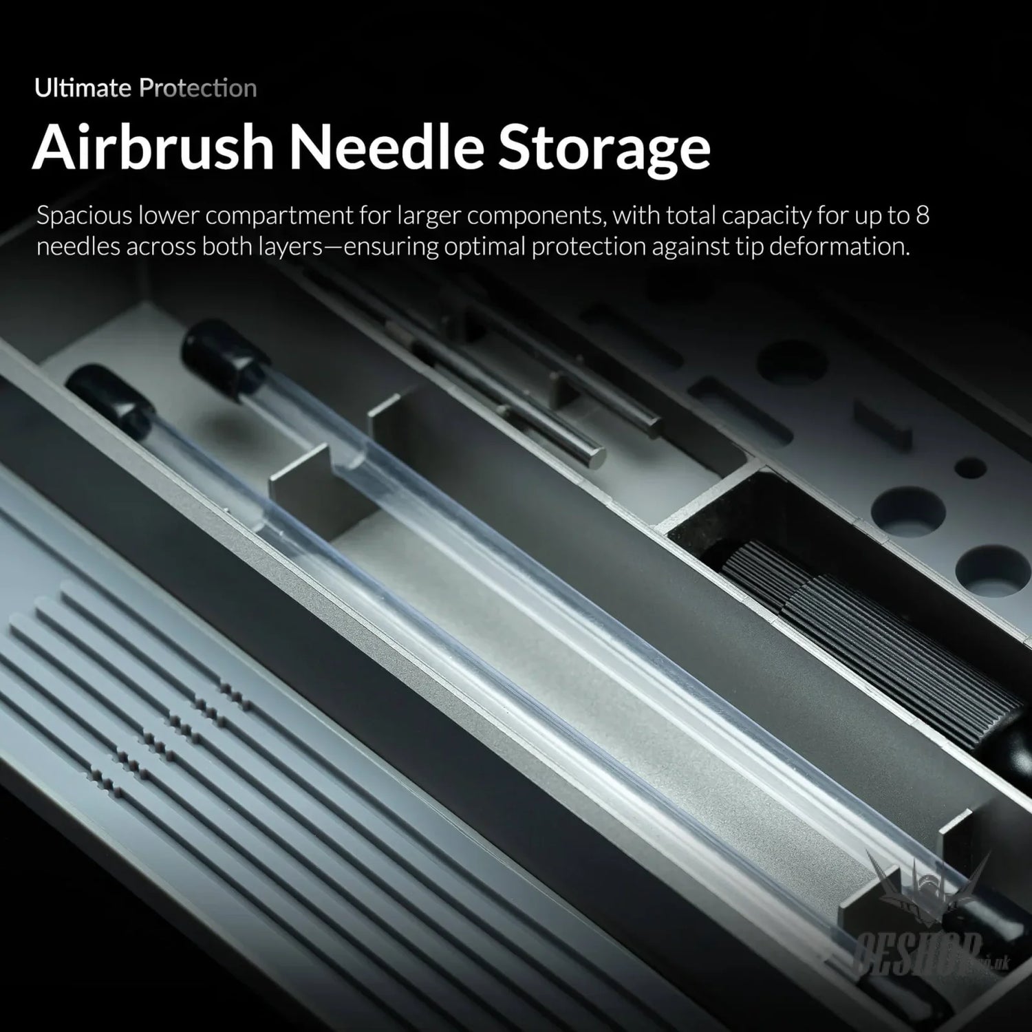 Featuring a two-tier modular layout, it securely stores your complete airbrush setup — from nozzles, needles, and caps to larger components. The upper layer accommodates 6 fan caps, 7 nozzle sets, and up to 8 needles, with added protection to prevent bending or damage. The lower compartment offers spacious storage for larger parts and accessories.