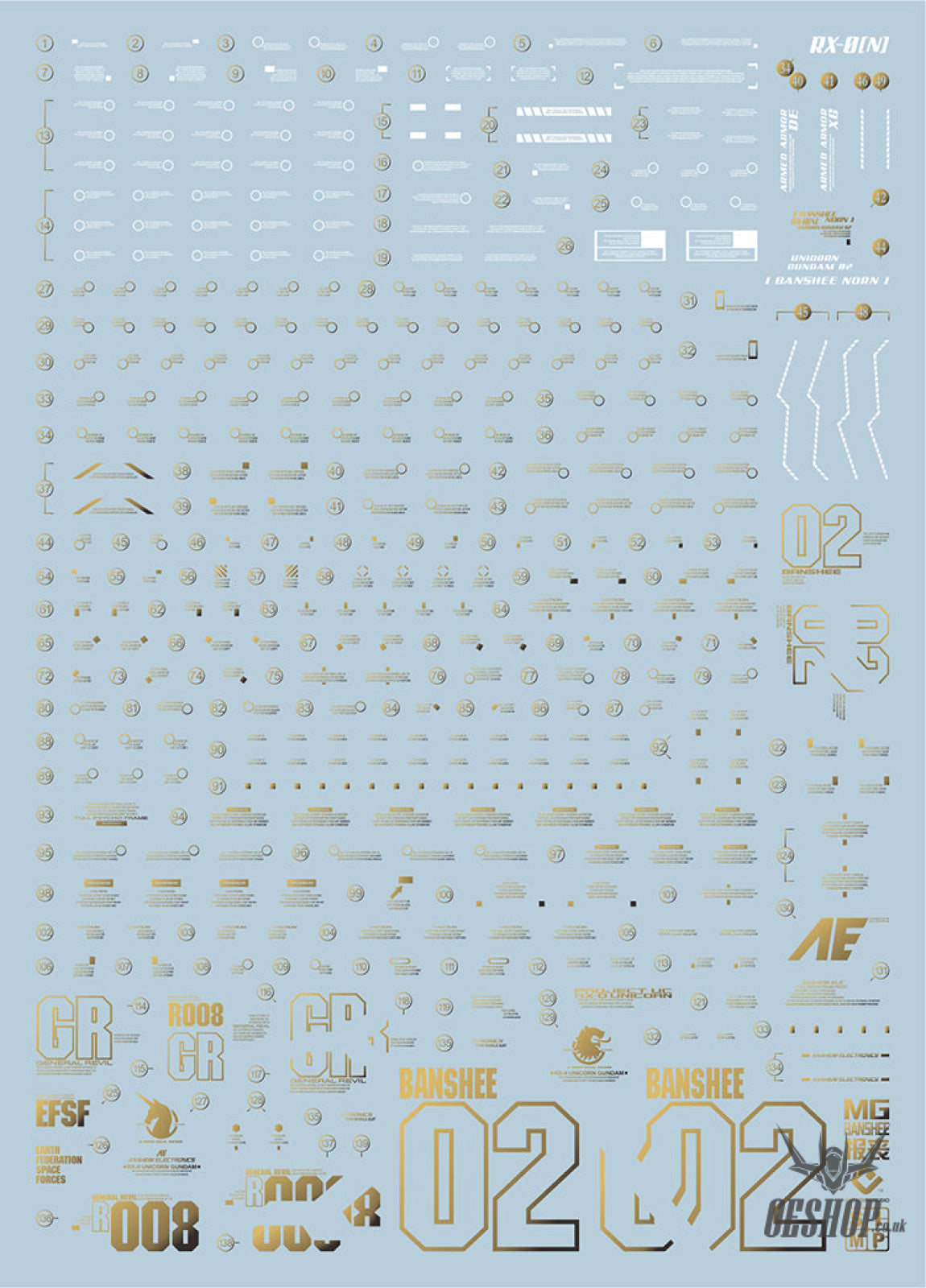 Custom waterslide decals for use with Bandai 1/100 MG Banshee Ver.ka