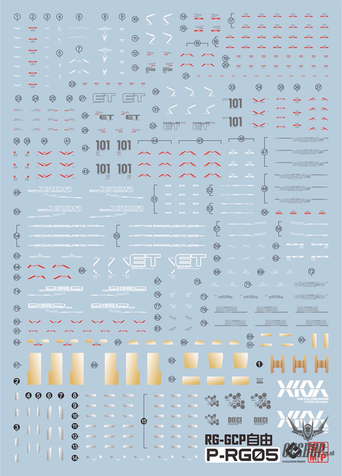 Custom waterslide decals for use with Bandai RG 1/144 Gundam Freedom Ver.GCP