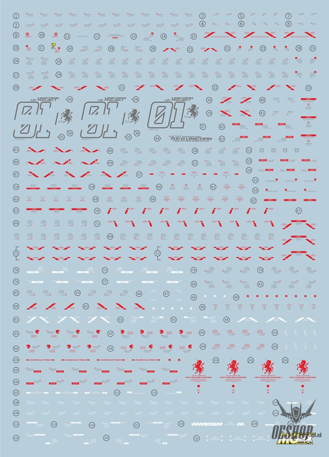 Custom waterslide decals for use with Bandai MG 1/100 Unicorn Gundam Ver.Ka