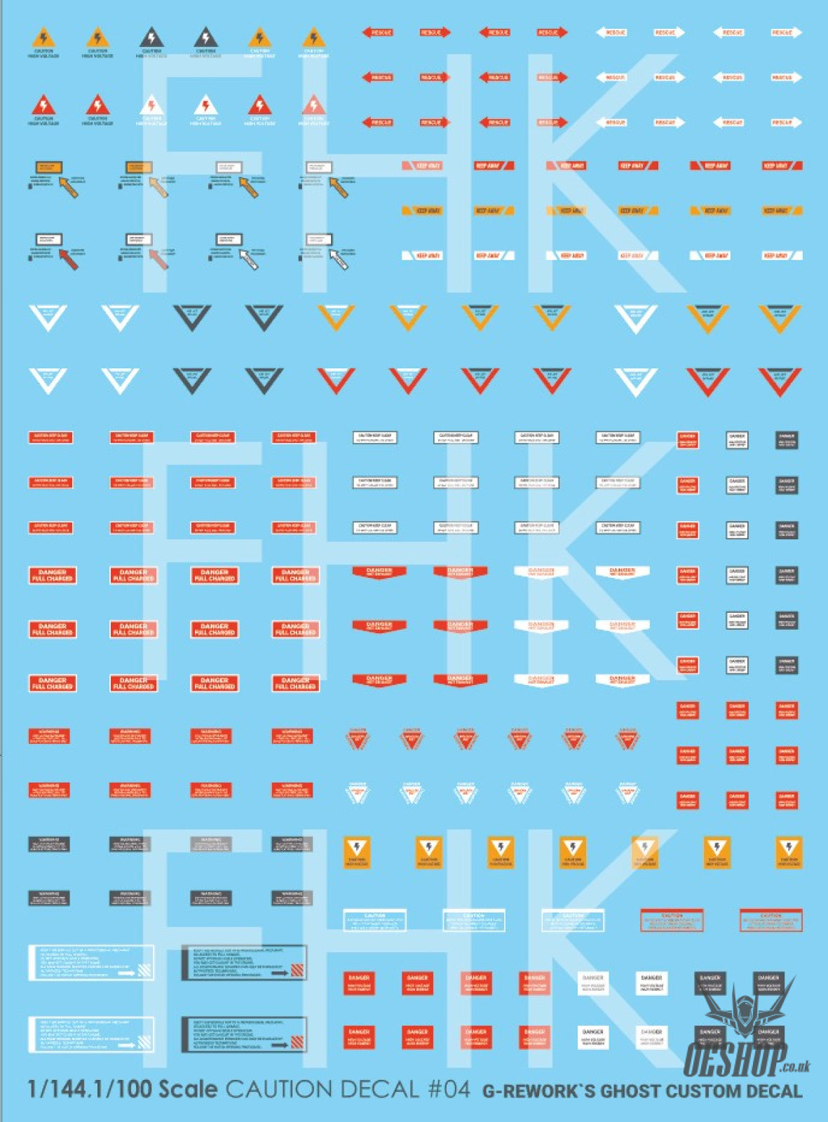 Custom waterslide decals from G-Rework featuring a variety of caution graphics that can be used on many model kits.
